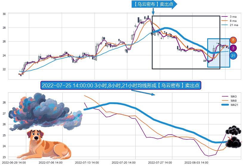 形态多维评估: ⚀ 2022-07-11 14:00:00小时-2022-08-09 14:00:00小时显现 3小时-8小时-21小时均线 【乌云密布】卖出点 看空信号,后市看跌,卖出