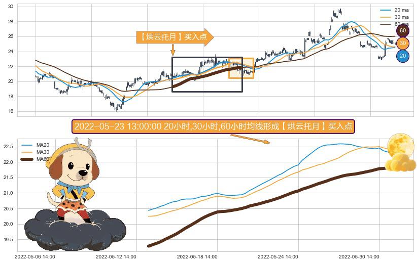 形态多维评估: ⚀ 2022-05-13 11:00:00小时-2022-05-31 13:00:00小时显现 20小时-30小时-60小时均线 【烘云托月】买入点 看多信号,后市看涨,买入