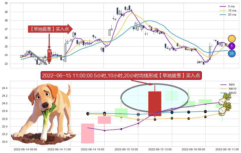 形态多维评估: ⚀ 2022-06-15 11:00:00小时显现 5小时-10小时-20小时均线 【旱地拔葱】买入点 看多信号,后市看涨,买入