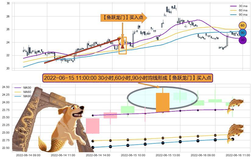 形态多维评估: ⚀ 2022-06-15 11:00:00小时显现 30小时-60小时-90小时均线 【鱼跃龙门】买入点 看多信号,后市看涨,买入