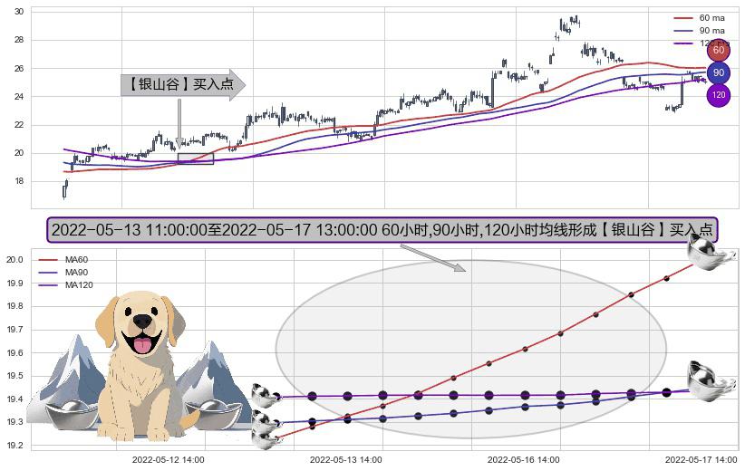 形态多维评估: ⚀ 2022-05-13 13:00:00-小时至2022-05-17 13:00:00-小时显现 60小时-90小时-120小时均线 【银山谷】买入点 看多信号,后市看涨,买入