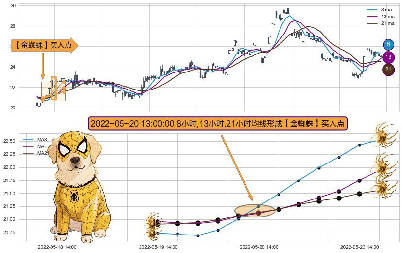 形态多维评估: ⚀ 2022-05-20 13:00:00小时显现 8小时-13小时-21小时均线 【金蜘蛛】买入点 看多信号,后市看涨,买入