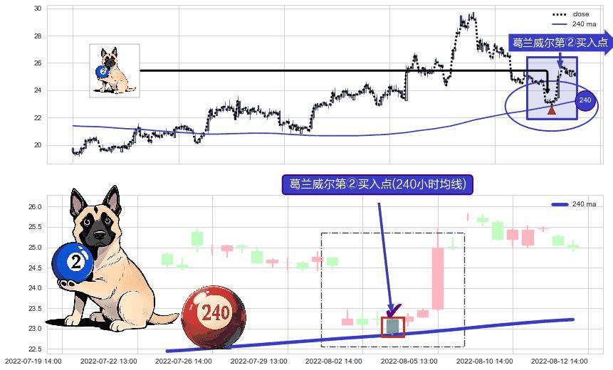 形态多维评估: ⚀ 2022-08-03 14:00:00-小时显现 葛兰威尔均线 240小时均线 第②买入点 上升趋势的中继信号,后市看涨,买进信号