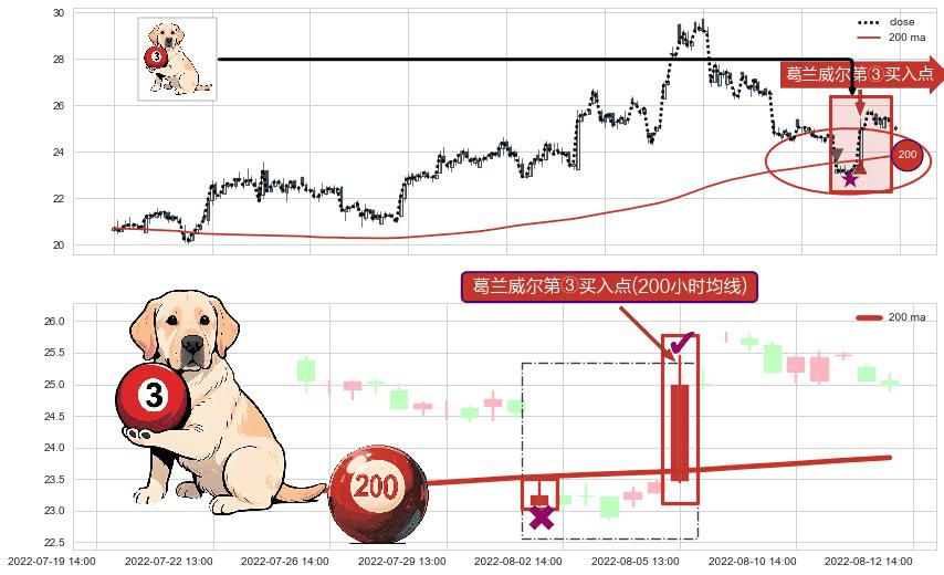 形态多维评估: ⚀ 2022-08-05 13:00:00-小时显现 葛兰威尔均线 200小时均线 第③买入点 上升趋势的中继信号,后市看涨,买进信号