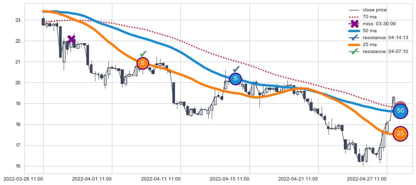 下跌趋势03-28 11:00-04-28 09:00,均线25, 50确认关键阻力2处