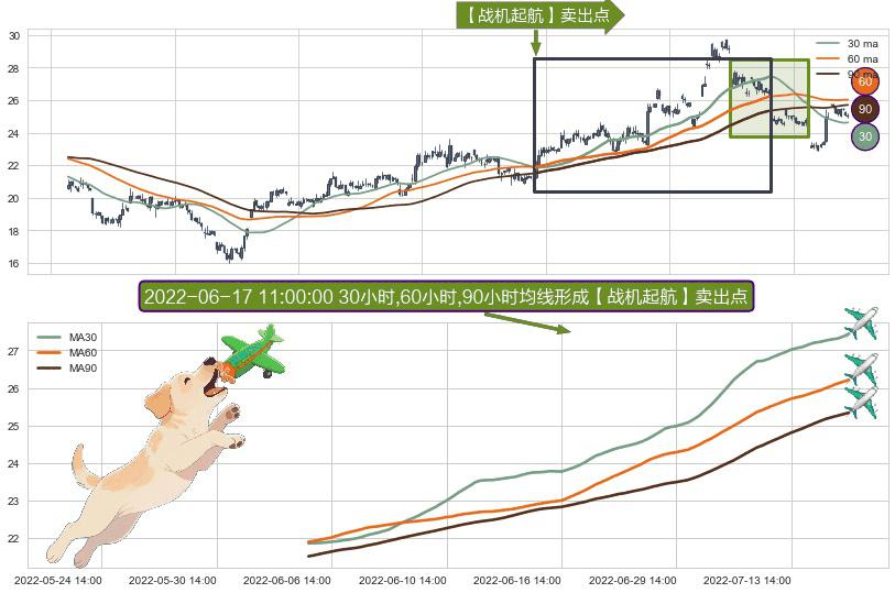 形态多维评估: ⚀ 2022-06-06 09:00:00小时-2022-07-20 14:00:00小时显现 30小时-60小时-90小时均线 【战机起航】卖出点 看空信号,后市看跌,卖出