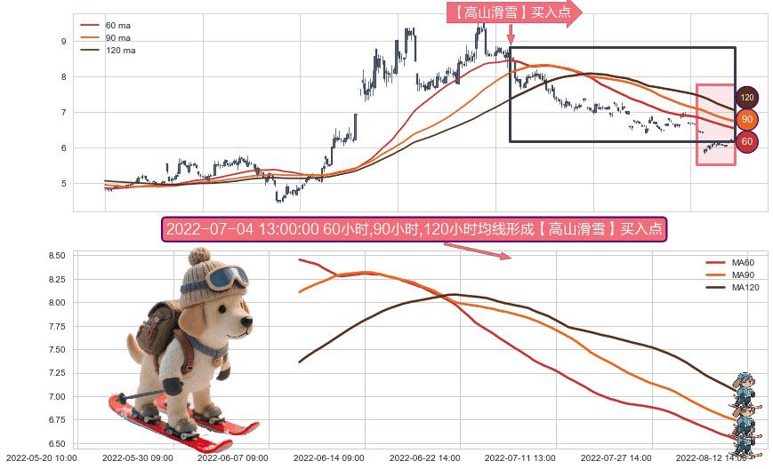 形态多维评估: ⚀ 2022-06-08 13:00:00小时-2022-08-12 14:00:00小时显现 60小时-90小时-120小时均线 【高山滑雪】买入点 看多信号,后市看涨,买入