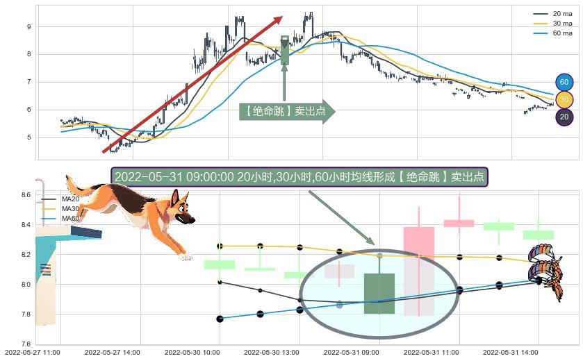 形态多维评估: ⚀ 2022-05-31 09:00:00小时显现 20小时-30小时-60小时均线 【绝命跳】卖出点 看空信号,后市看跌,卖出
