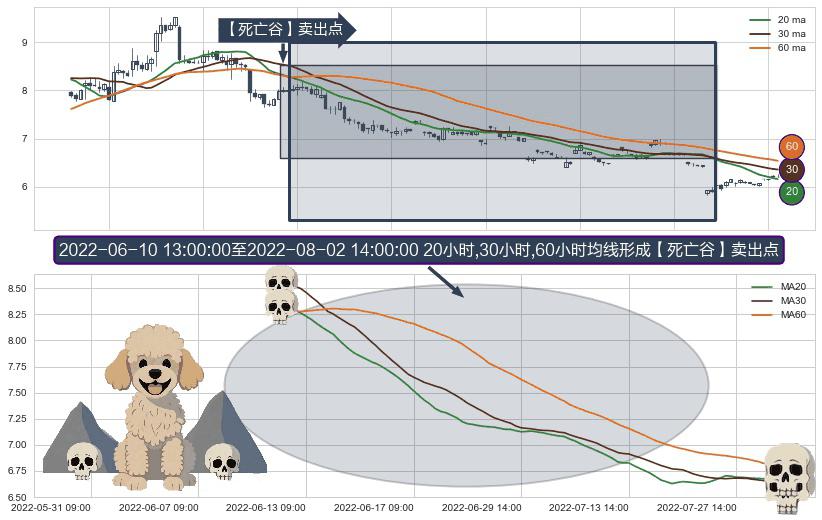 形态多维评估: ⚀ 2022-06-10 14:00:00-小时至2022-08-02 14:00:00-小时显现 20小时-30小时-60小时均线 【死亡谷】卖出点 看空信号,后市看跌,卖出