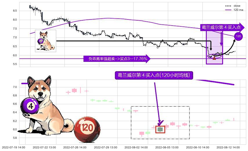 形态多维评估: ⚀ 2022-08-03 14:00:00-小时显现 葛兰威尔均线 120小时均线 第④买入点 下降趋势均值回复的短线反弹信号,后市看涨,买进信号