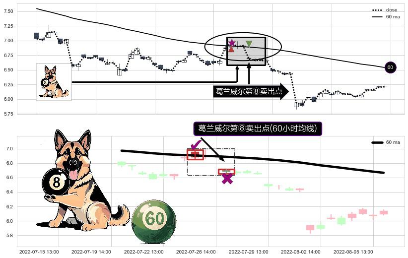形态多维评估: ⚀ 2022-07-27 13:00:00-小时显现 葛兰威尔均线 60小时均线 第⑧卖出点 下降趋势的中继信号,后市看跌,卖出信号