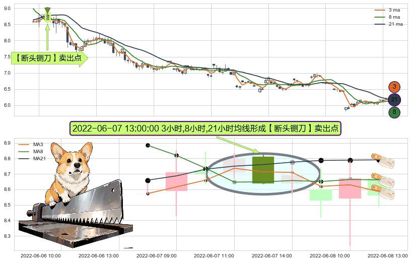 形态多维评估: ⚀ 2022-06-07 13:00:00小时显现 3小时-8小时-21小时均线 【断头铡刀】卖出点 看空信号,后市看跌,卖出