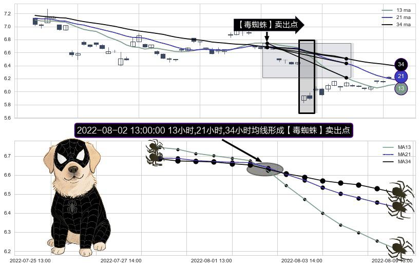 形态多维评估: ⚀ 2022-08-02 13:00:00小时显现 13小时-21小时-34小时均线 【毒蜘蛛】卖出点 看空信号,后市看跌,卖出
