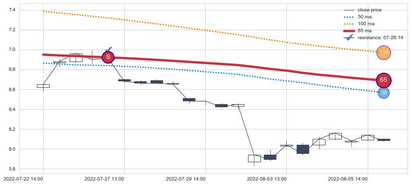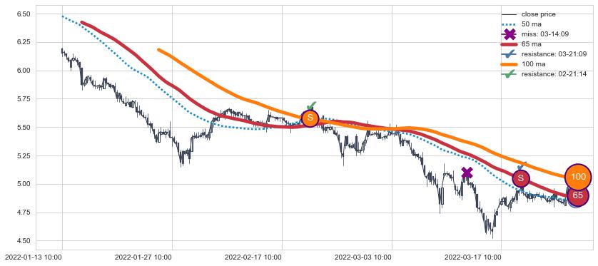 下跌趋势01-13 10:00-03-25 10:00,均线65, 100确认关键阻力2处
