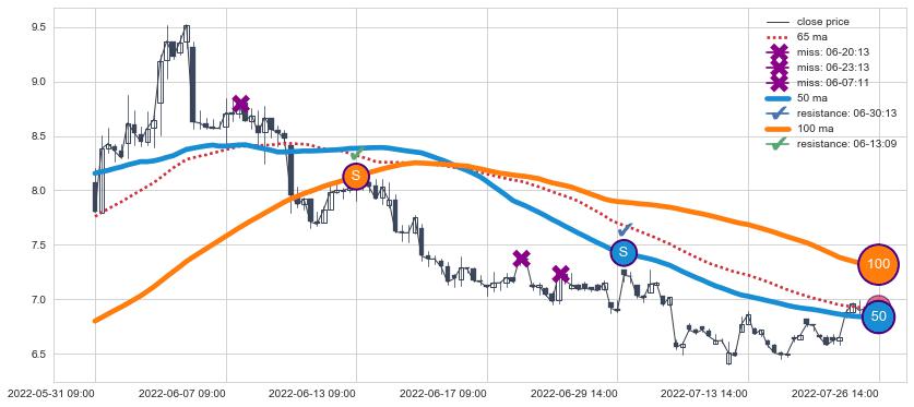 下跌趋势05-31 09:00-07-26 14:00,均线50, 100确认关键阻力2处