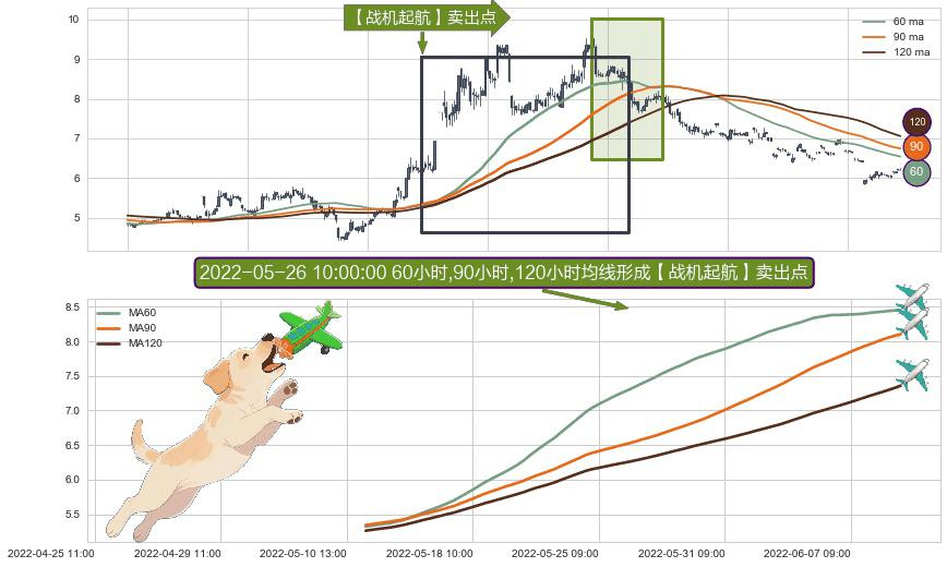 形态多维评估: ⚀ 2022-05-11 10:00:00小时-2022-06-08 13:00:00小时显现 60小时-90小时-120小时均线 【战机起航】卖出点 看空信号,后市看跌,卖出