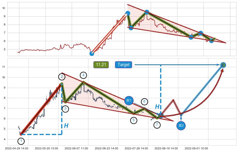 ➢ 最小中继整理涨幅→𝐇: 4.90 (𝐇楔型旗杆的长度:楔型起点→顶点)