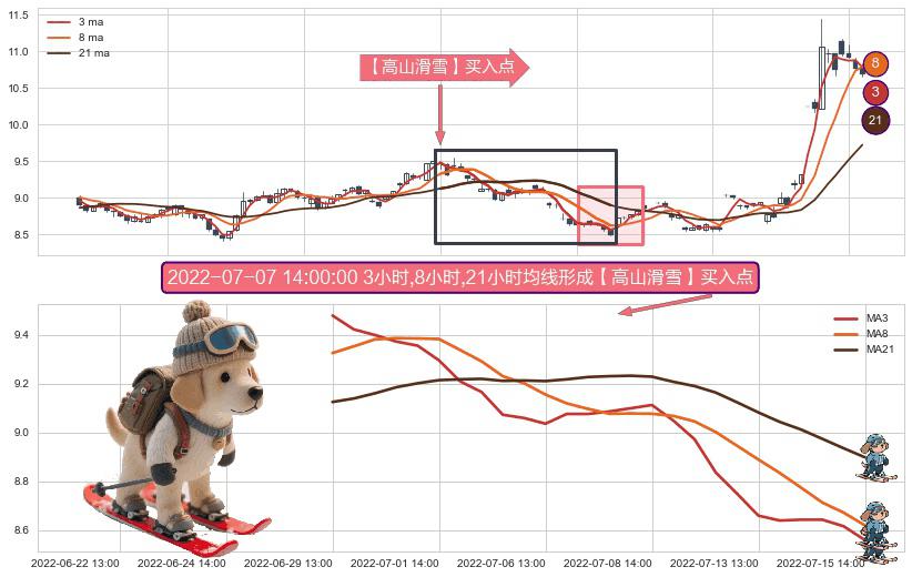 ⚀ 2022-06-29 13:00:00小时-2022-07-15 14:00:00小时显现 3小时-8小时-21小时均线 【高山滑雪】买入点 看多信号,后市看涨,买入