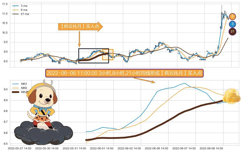 ⚀ 2022-05-31 14:00:00小时-2022-06-09 09:00:00小时显现 3小时-8小时-21小时均线 【烘云托月】买入点 看多信号,后市看涨,买入