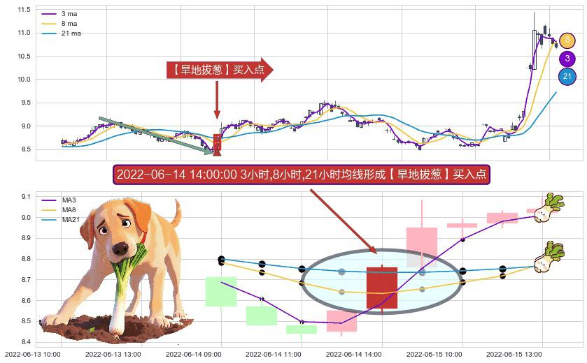 ⚀ 2022-06-14 14:00:00小时显现 3小时-8小时-21小时均线 【旱地拔葱】买入点 看多信号,后市看涨,买入