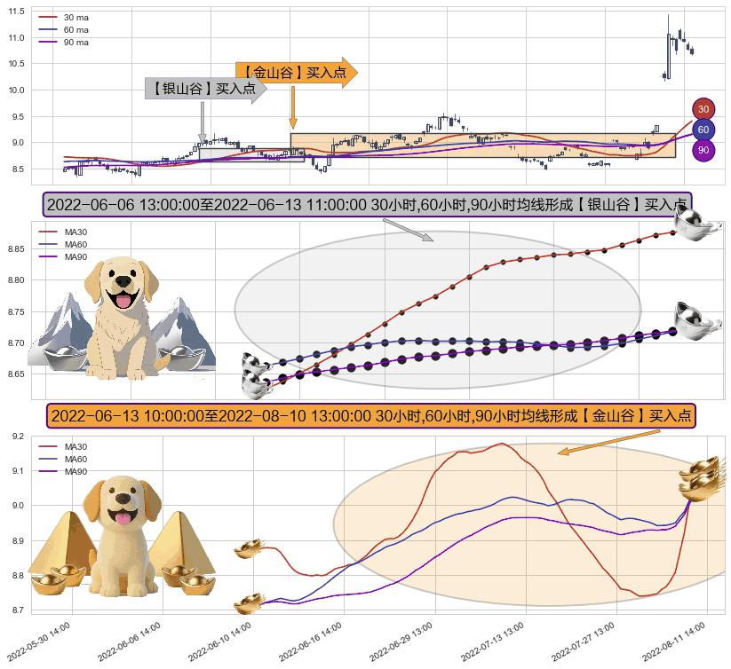⚀ 2022-06-13 11:00:00-小时至2022-08-10 13:00:00-小时显现 30小时-60小时-90小时均线 【金山谷】买入点 其再次确认了买入信号,可靠性更强,买入