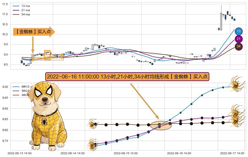 ⚀ 2022-06-16 11:00:00小时显现 13小时-21小时-34小时均线 【金蜘蛛】买入点 看多信号,后市看涨,买入