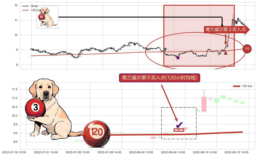 ⚀ 2022-08-04 13:00:00-小时显现 葛兰威尔均线 120小时均线 第③买入点 上升趋势的中继信号,后市看涨,买进信号