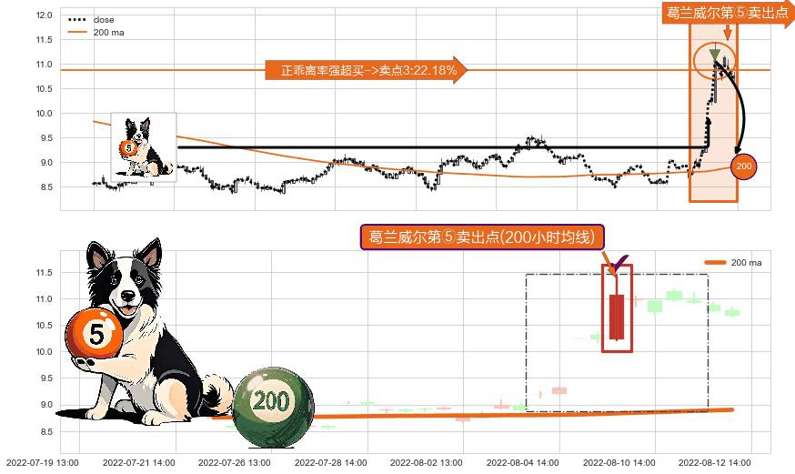 ⚀ 2022-08-09 14:00:00-小时显现 葛兰威尔均线 200小时均线 第⑤卖出点 上升趋势均值回复的短线回落信号,后市看跌,卖出信号