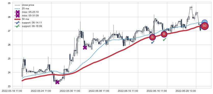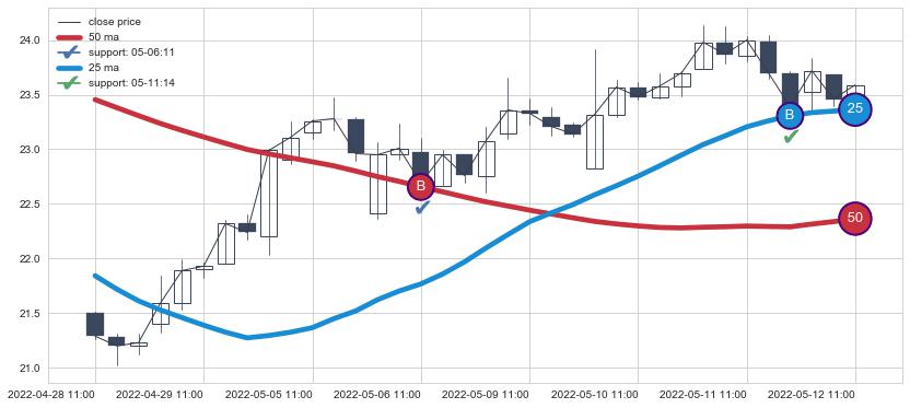 上涨趋势04-28 11:00-05-12 11:00,均线25, 50确认关键支撑2处