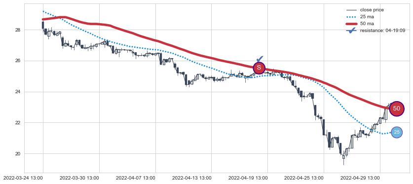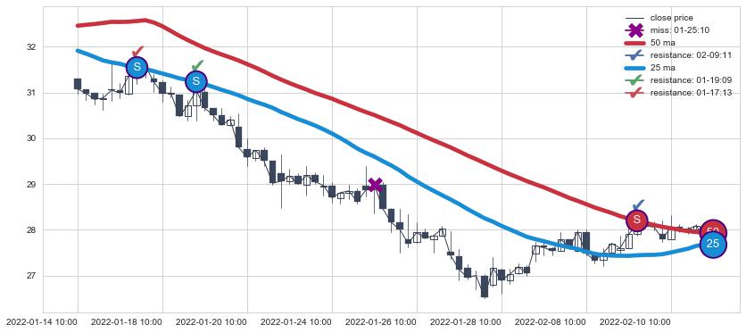 下跌趋势01-14 10:00-02-11 09:00,均线25, 50确认关键阻力3处