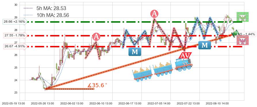 ♞ 5小时均线:28.53,10小时均线:28.56→ 快线<慢线