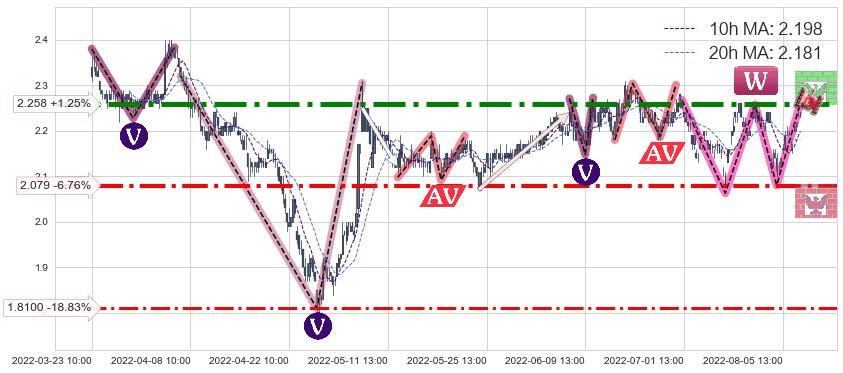 ♘ 阻力价格位2.258,可信任强度99.00%,距离最后交易2022-08-12 14:00形成的收盘价格2.230相差 +1.25%