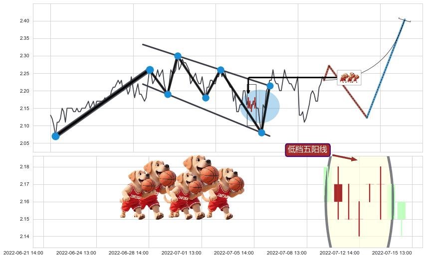 | 4 🅚:【烘云托月】买入点 ➕ 📐:降旗形向上突破击穿阻力位, 猜想持续拉升上涨,被突破的阻力位已变为支撑位 ☞ 看多信号 ⇥ 【均线】交织【图形】⇥ 综合量化分数: 52 | > |
