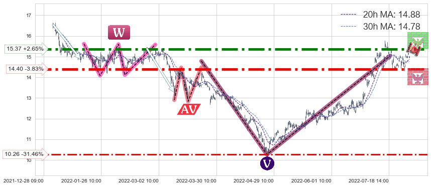♘ 阻力价格位15.37,可信任强度91.04%,距离最后交易2022-08-12 14:00形成的收盘价格14.97相差 +2.65%