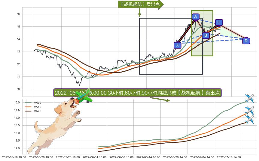 从2022-06-09 13:00至2022-07-21 13:00,共包含79个小时,阶段股价上涨19.26%,阶段股价变动位移路程比: 1 : 4,上涨趋势角度: 55.8,2022-06-30 13:00向⇪形成缺口,跳空上涨+6.67%