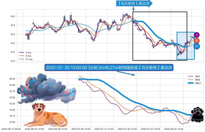 ⚀ 2022-07-04 13:00:00小时-2022-08-09 13:00:00小时显现 3小时-8小时-21小时均线 【乌云密布】卖出点 看空信号,后市看跌,卖出