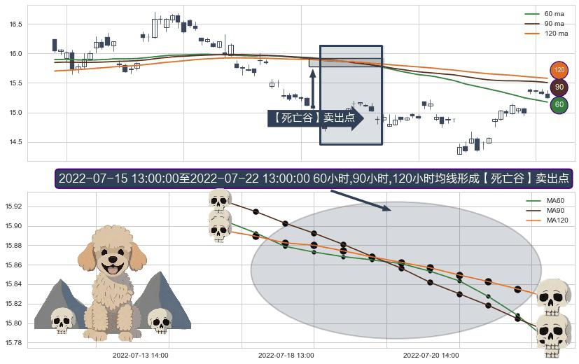 ⚀ 2022-07-15 14:00:00-小时至2022-07-22 13:00:00-小时显现 60小时-90小时-120小时均线 【死亡谷】卖出点 看空信号,后市看跌,卖出