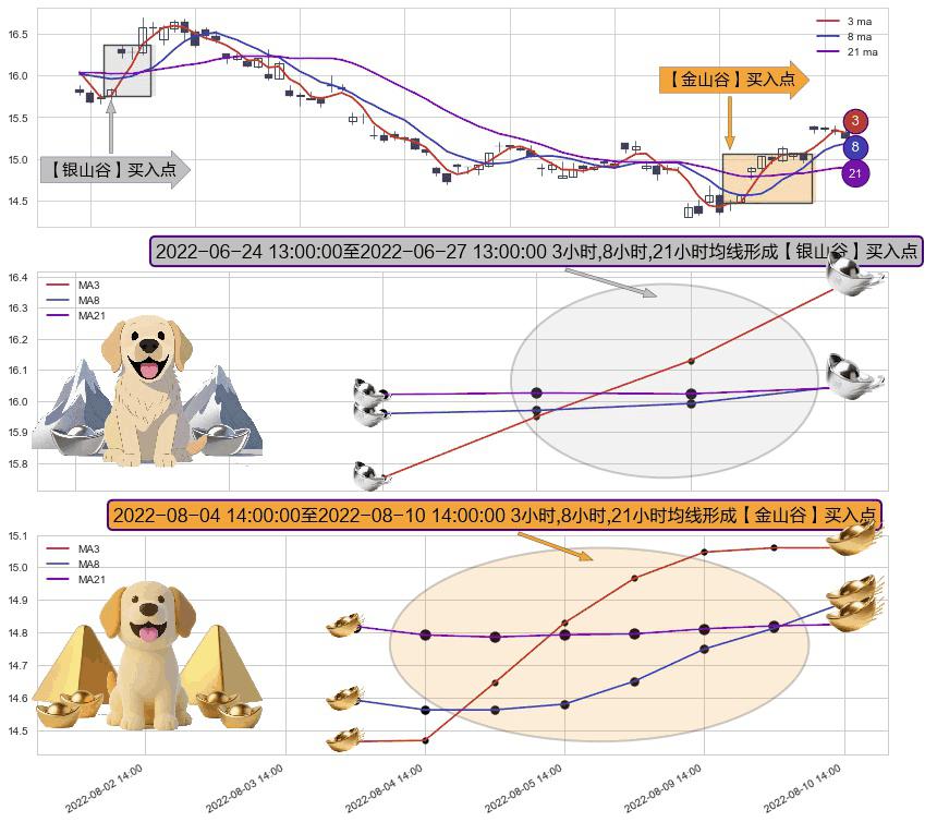 ⚃ 2022-08-05 13:00:00-小时至2022-08-10 14:00:00-小时显现 3小时-8小时-21小时均线 【金山谷】买入点 其再次确认了买入信号,可靠性更强,买入