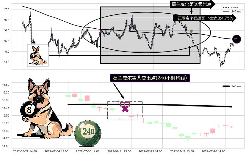 ⚀ 2022-07-08 14:00:00-小时显现 葛兰威尔均线 240小时均线 第⑧卖出点 下降趋势的中继信号,后市看跌,卖出信号
