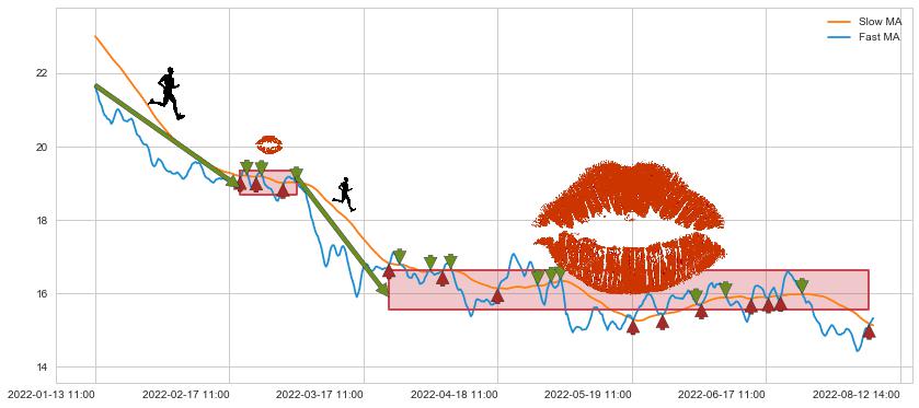 ⚀ 卖点向下突破均线后,价格走势有持续向下的迹象,但动能稍显不足,迟迟不能远离均线
