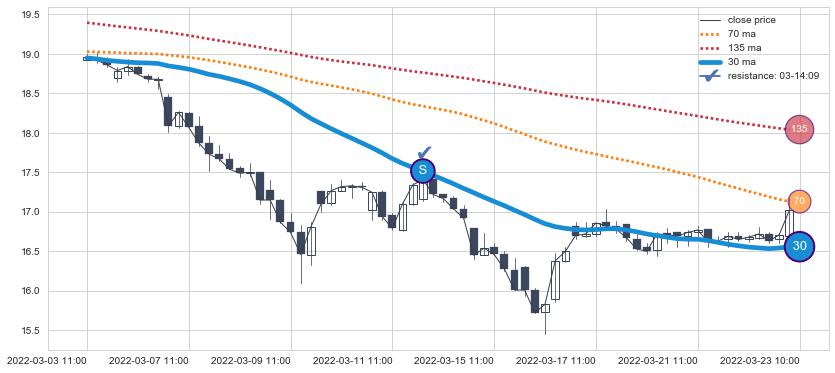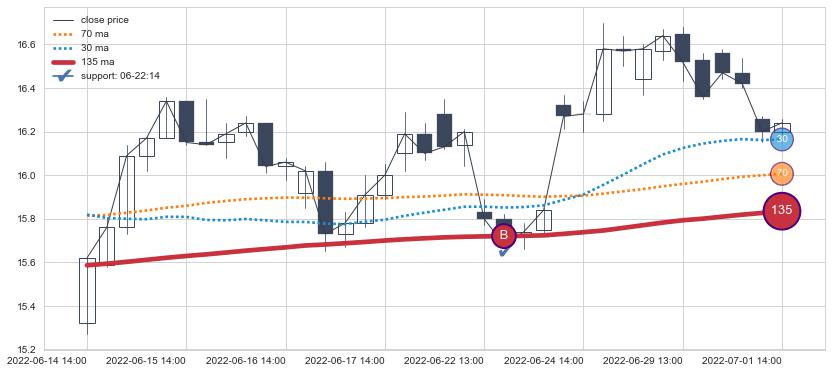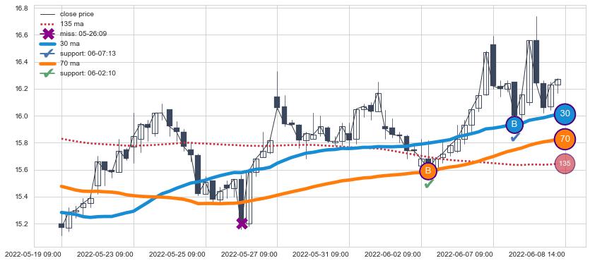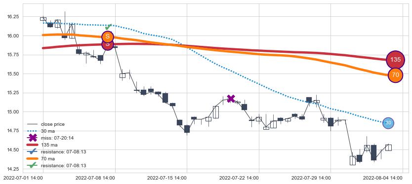 ⚂ 2022-05-27 09:00:00-小时均线向上突破,2022-07-08 14:00:00-小时重新下穿均线破位,均线阻力再次生效