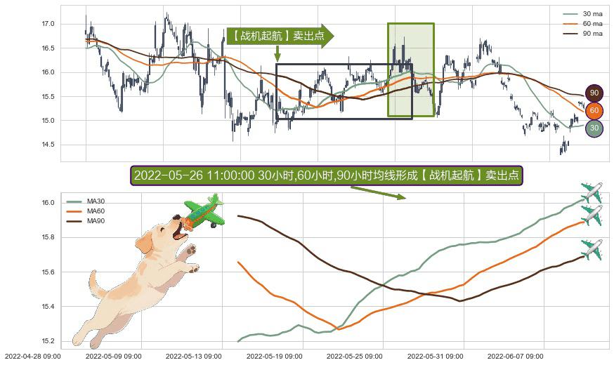 ⚀ 2022-05-13 14:00:00小时-2022-06-09 09:00:00小时显现 30小时-60小时-90小时均线 【战机起航】卖出点 看空信号,后市看跌,卖出