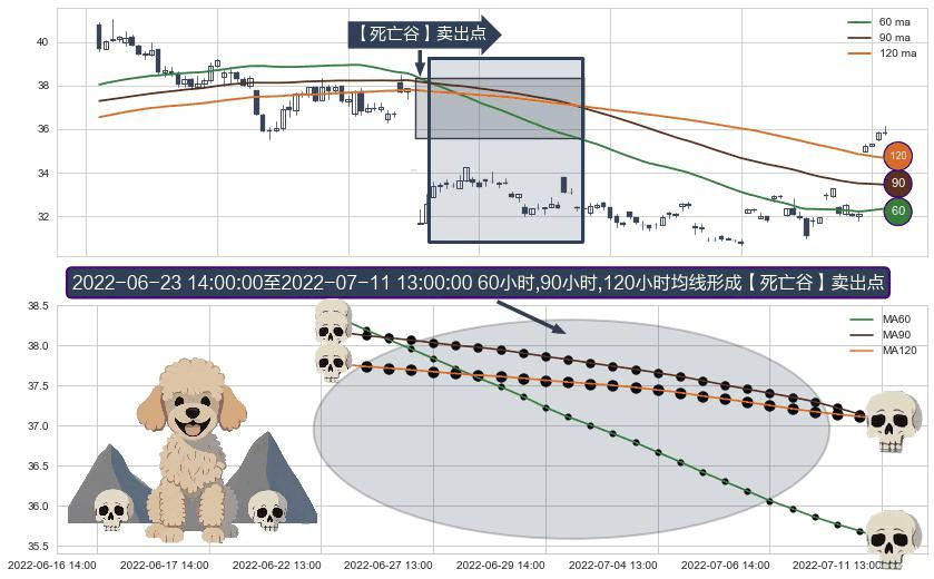 ⚀ 2022-06-24 13:00:00-小时至2022-07-11 13:00:00-小时显现 60小时-90小时-120小时均线 【死亡谷】卖出点 看空信号,后市看跌,卖出