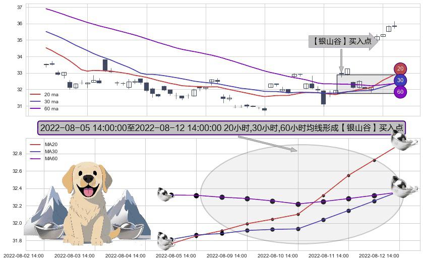 ⚀ 2022-08-09 13:00:00-小时至2022-08-12 14:00:00-小时显现 20小时-30小时-60小时均线 【银山谷】买入点 看多信号,后市看涨,买入
