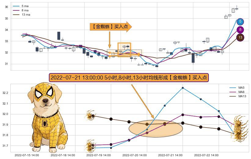 ⚀ 2022-07-21 13:00:00小时显现 5小时-8小时-13小时均线 【金蜘蛛】买入点 看多信号,后市看涨,买入