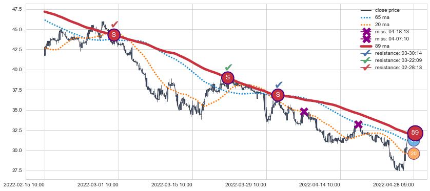 ➢ 最优均线组合共正确确认支撑阻力信号7处,正确确认率 50.00%