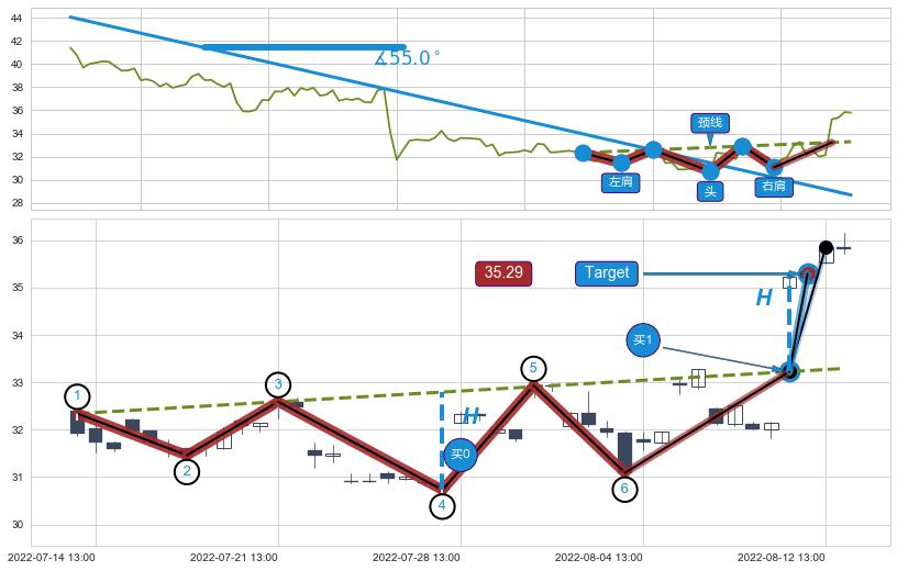 从2022-04-26 09:00至2022-06-08 10:00,共包含133个小时,阶段股价上涨38.44%,阶段股价变动位移路程比: 1 : 3,上涨趋势角度: 57.9