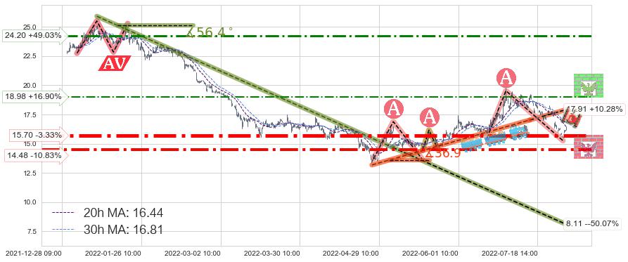 ♘ 阻力价格位18.98,可信任强度48.53%,距离最后交易2022-08-12 14:00形成的收盘价格16.24相差 +16.90%