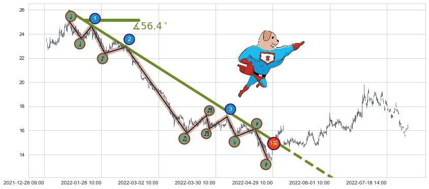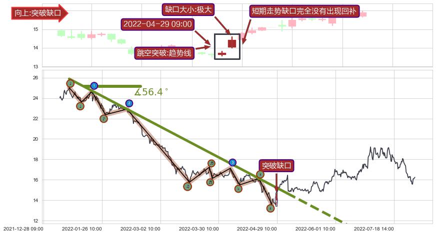 从2022-01-10 14:00至2022-05-09 13:00,共包含374个小时,阶段股价下跌-41.76%,阶段股价变动位移路程比: 1 : 6,下跌趋势角度: 56.4