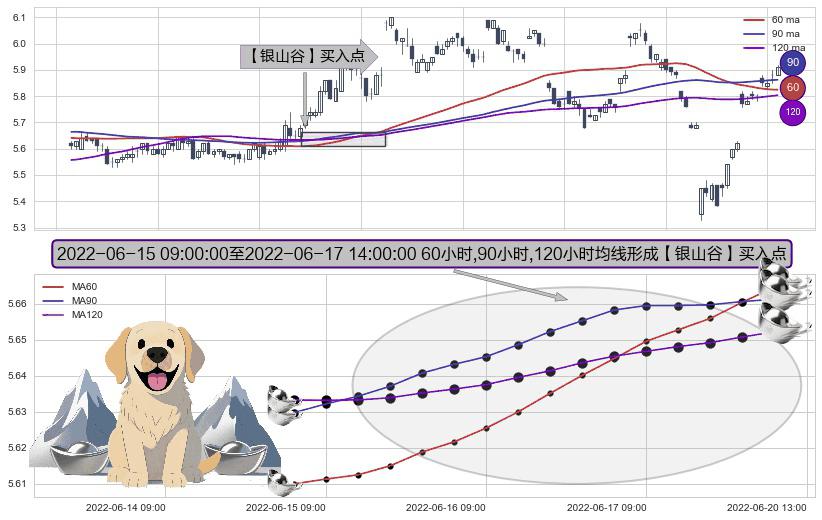 ⚀ 2022-06-15 10:00:00-小时至2022-06-17 14:00:00-小时显现 60小时-90小时-120小时均线 【银山谷】买入点 看多信号,后市看涨,买入